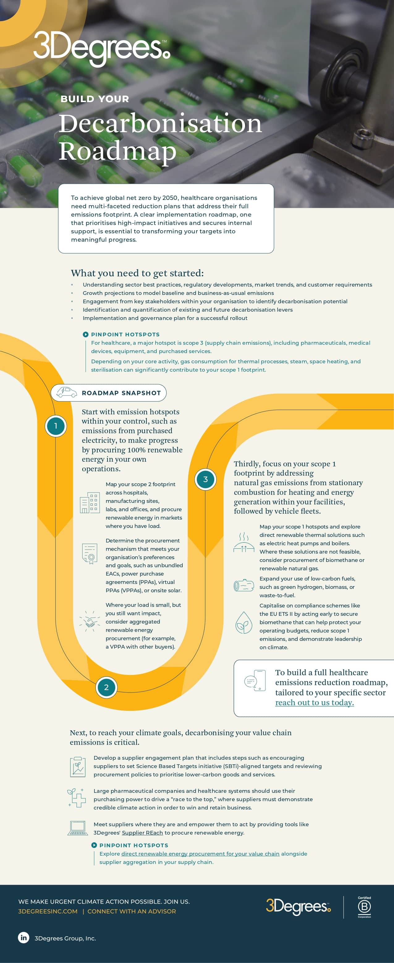 To help, we’ve outlined a decarbonisation roadmap tailored to healthcare regardless of where you are in the journey. See examples of how peers in various industries are taking action, and more.